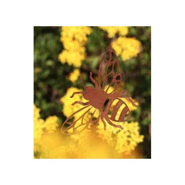 De prachtige bij met uitsijdingen is vervaardigd uit speciaal behandeld metaal met een roestige look en staat leuk aan de tuinmuur, bij het insectenhotel maar kan ook aan de muur in de keuken voor een leuke sfeer zorgen.