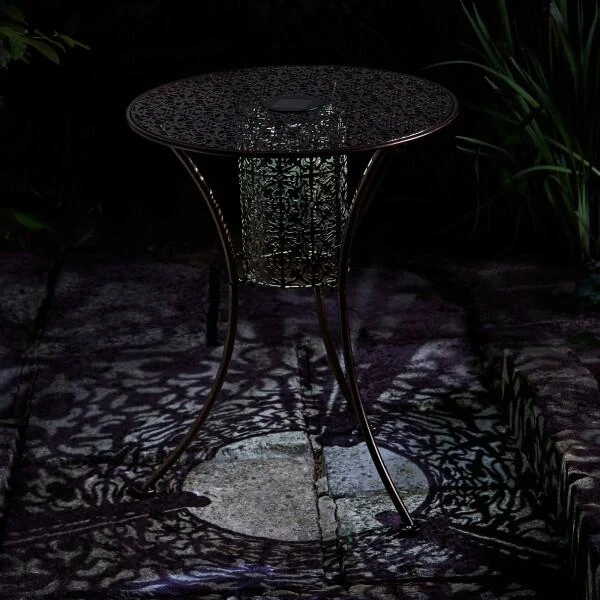 Deze leuke bijzettafel in sierlijk metaal heeft een centraal ingebouwd zonnepaneeltje in het tafelblad dat de bijhorende batterij oplaadt in vol zonlicht. Dit zorgt ervoor dat de tafel prachtig oplicht wannneer de avond valt!