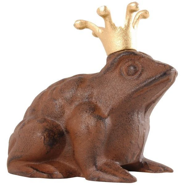Een leuke kikker vervaardigd in gietijzer en voorzien van een gouden kroontje. De perfecte decoratie aan de vijver, bij een waterschaal of -partij, op het terras, tussen de beplanting en zelfs ook in het interieur.
