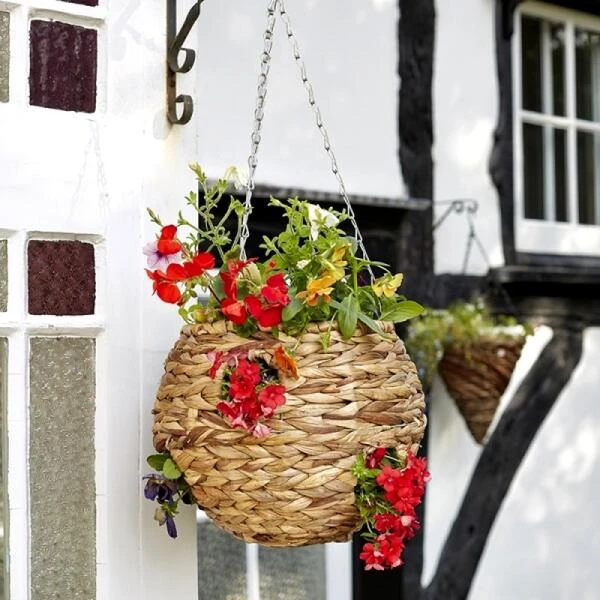 Bolvormige hangmand van natuurlijke vezels. De ronde mand met natuurlijke uitstraling heeft bovenaan een grote vulopening en rondom 6 plantgaten. Binnenin de mand beschermt een plastiek cover de natuurlijke vezels van de mand.