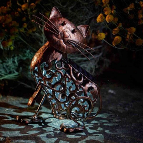 Leuk en decoratief katje met een schattige wiebelkop voor op het terras of op de tuintafel. Het metalen kattenbeeld is overdag een mooie tuindecoratie en wordt een charmant licht wanneer de avond valt. ’s Avonds bij donker ontstaat er een mooi schaduwpatroon op de grond als het licht doorheen het sierlijke lijf van de poes schijnt.