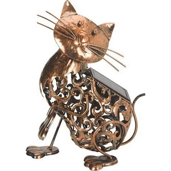 De metalen kat is afgewerkt in een koperkleurig gelakt metaal en voorzien van 1 ledlamp waarvan de batterij overdag oplaadt via het geïntegreerd zonnepaneel.