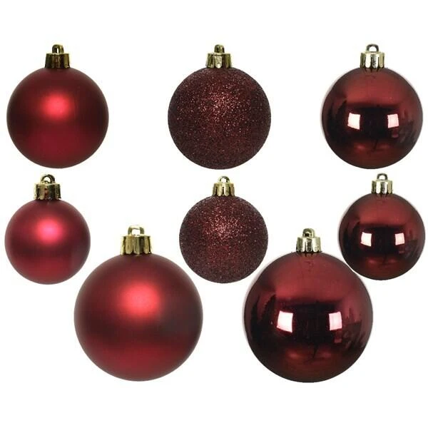 Het set bestaat uit een combinatie van glanzende, matte en glitterende kerstballen in verschillende afmetingen.
