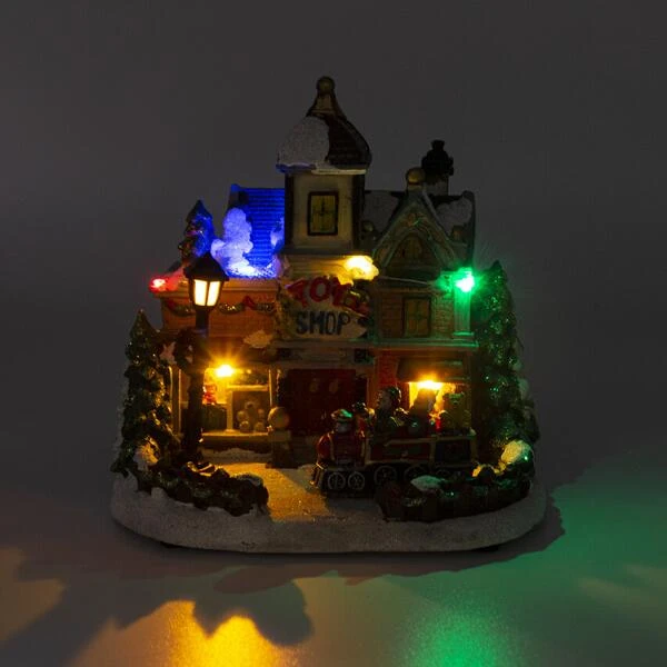 Dit kersttafereel Toy Shop heeft alles te bieden wat kinderen maar kunnen wensen. Alles wat op hun verlanglijstje staat voor kerst zullen ze zeker in het winkeltje van de kerstman kunnen bewonderen. Het tafereel is bedekt met een wit laagje sneeuw, de kerstbomen staan te fonkelen en twee kinderen amuseren zich in de trein die vooraan staat opgesteld.