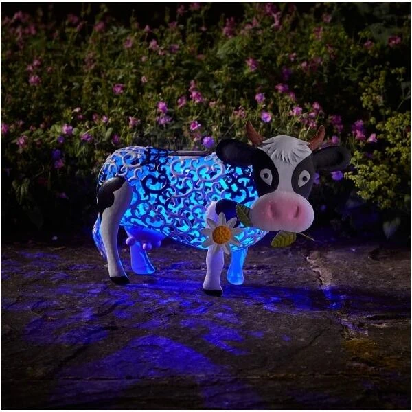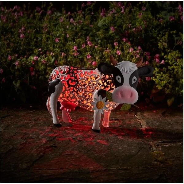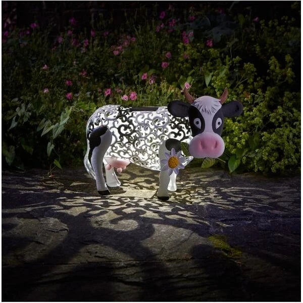 Een grappige koe die een bloem plukt uit de weide. De verlichting op zonne-energie zorgt voor de nodige sfeer.