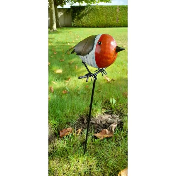 Prik het roodborstje met de bijgeleverde stok en grondpin in jouw border of plantenbak en geniet van zijn gezelschap.