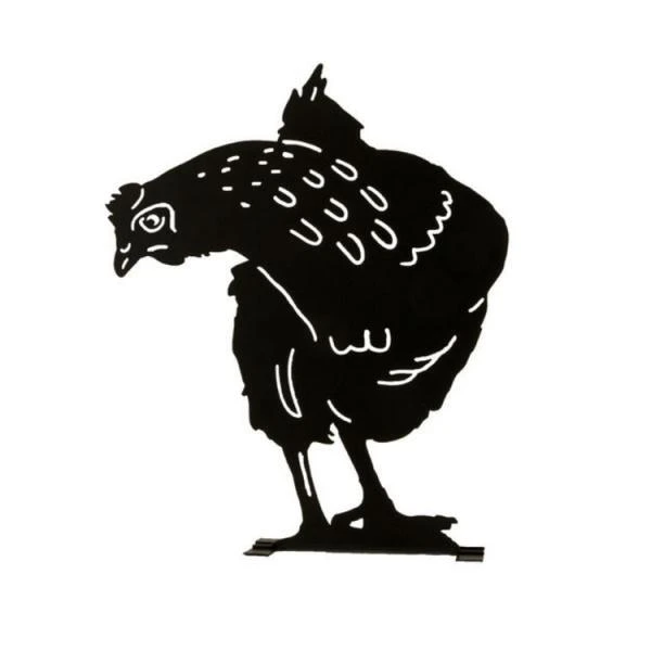 Ludiek en decoratief silhouet van een nieuwsgierige kip. Het silhouet is vervaardigd uit metaal bewerkt met een roestwerende, milieuvriendelijke zwarte verf.