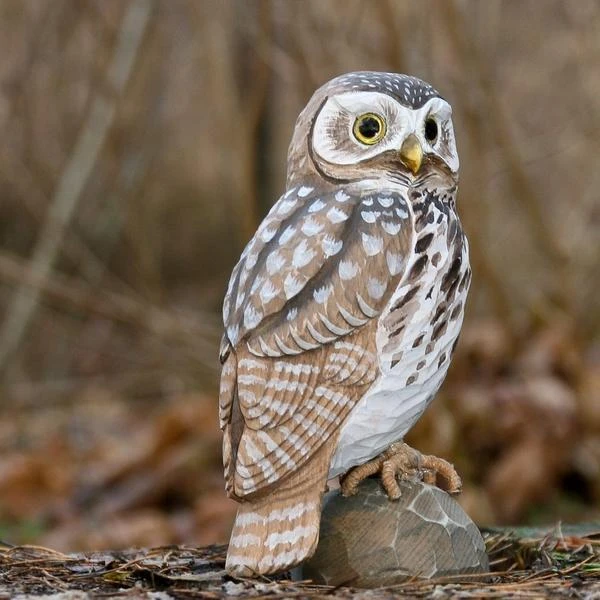 Ambachtelijk vormgegeven houten steenuil. De steenuil wordt op ware grootte weergegeven en is beschilderd met milieuvriendelijke verf.