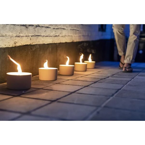 De zwarte kaars zit in een strakke, beige kleurige terracotta schaal.