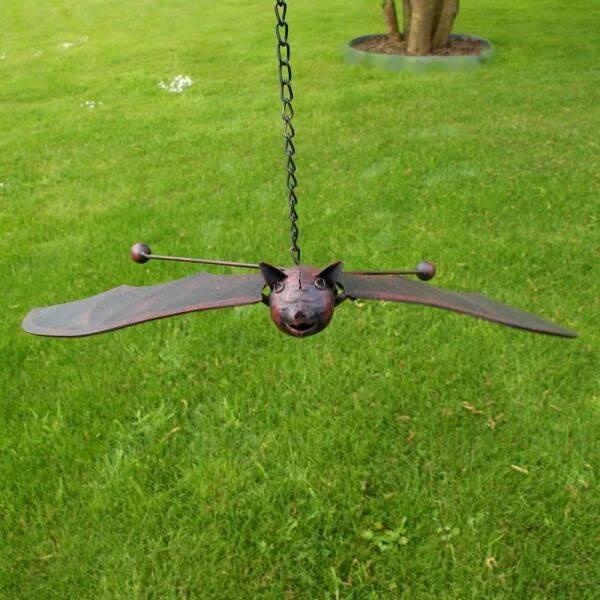 Een metalen, vliegende vleermuis met vleugels die wapperen in de wind.