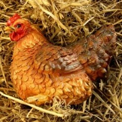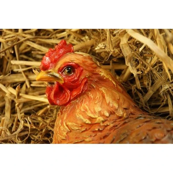 Prachtig levensechte weergave van een zittende kip. Mooi beeld vervaardigt uit duurzaam kunsthars geschilderd als een echte bruine legkip